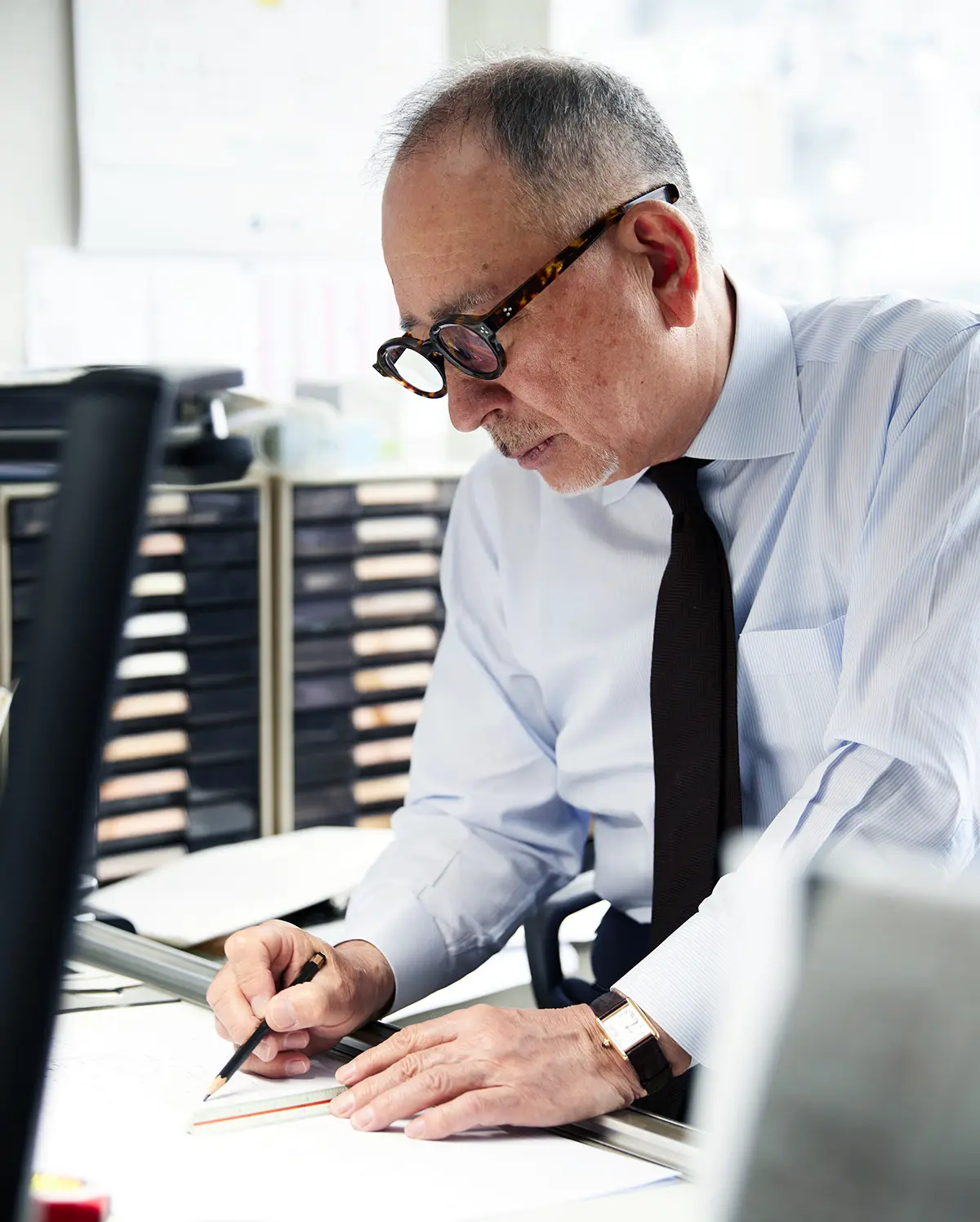建物のしつらいは内から湧いてくるものだと思います。緯⽷、経⽷を織り込むように京都の感性をさりげなく潜ませながら、モダンでシンプル、それでいてストーリーを感じさせるような建物にしたいと考えました。意匠において配慮したのは、⽊のように⾃ずと⽣えてきたかのように、そこに在ることが⾃然であり、周囲に優しく馴染み、溶け込んでいく⾒え⽅です。街は常に変化しています。その変化を受け⽌めながら、10年、20年経ってもそこに美しく⽣きていく意匠を意識しました。