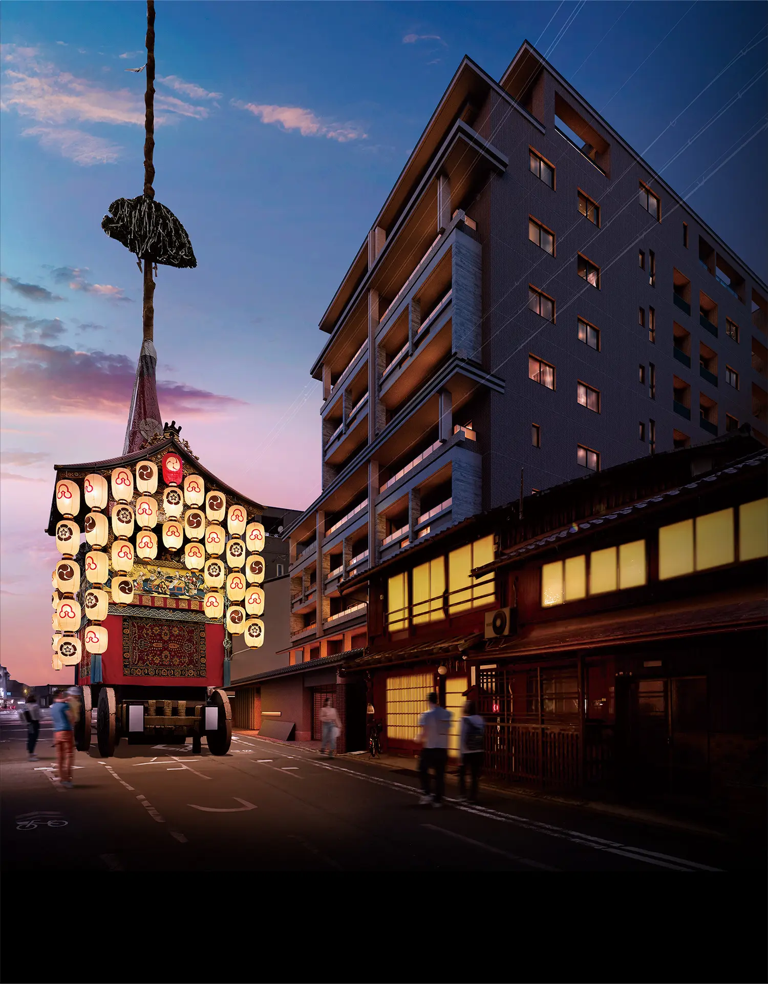 ※1.掲載の外観完成予想CGは、計画段階の図面を基に描いたものと、祗園祭時の周辺環境を撮影(2024年7月)したものを合成加工したもので実際とは異なります。また、今後の周辺環境の変化に伴い将来にわたって保証されるものではありません。なお、外観の細部・設備機器・配管及び電柱・架線・道路標識・周辺建物類等は一部省略又は簡略化しております。植栽は特定の季節の状況を表現したものではなく、竣工時には完成予想CG程度には成長しておりません。タイルや各種部材につきましては、実物と質感・色等の見え方が異なる場合があります。